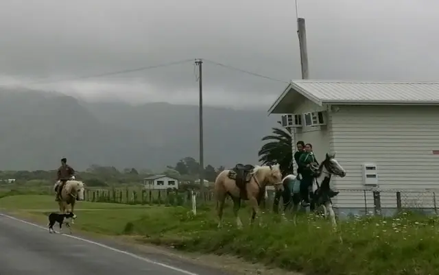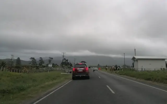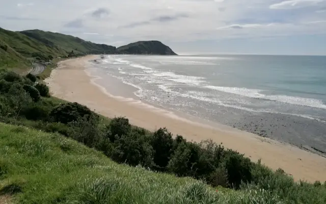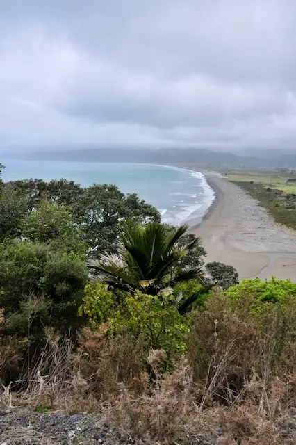 Happily, disregarding sandy feet and wet bum, I went on today’s way. Similarly to the previous day, I was on a coastal drive first and then on winding, hilly roads. Showers came and went while I travelled past orchards, vineyards, mountainous and plain farmland, forests, horse country – apart from the sheep and the cattle, of course. My stop at Hicks Bay, the northernmost point of the East Coast and the easternmost point of the Bay of Plenty, was short but dry. The cloud cover thick and dark made for a dramatic mood, no doubt.